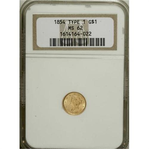<B>1854 G$1 Type One MS62 NGC.</B></I> NGC Census: (988/749). PCGS Population (423/477). Mintage: 855,502. Numismedia Wsl. Price for NGC/PCGS coin in MS62: $340. (#7525)<BR><BR><B>Coin Engraver:</B> James B. Longacre<BR><BR><b>Shipping:</b> Coins & Currency (<a target="_blank" href="http://www.heritageauctions.com/common/shipping.php">view shipping information</a>)