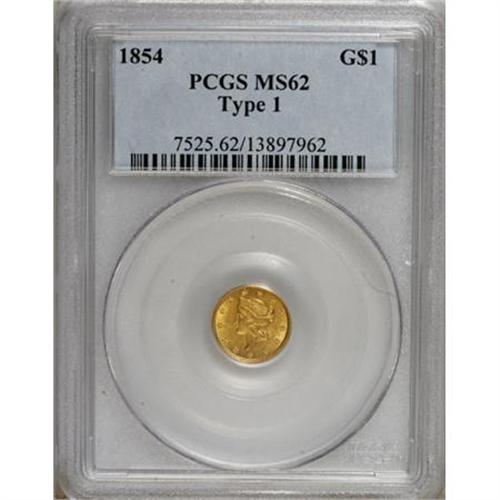 <B>1854 G$1 Type One MS62 PCGS.</B></I> PCGS Population (411/460). NGC Census: (958/732). Mintage: 855,502. Numismedia Wsl. Price for NGC/PCGS coin in MS62: $300. (#7525)<BR><BR><B>Coin Engraver:</B> James B. Longacre<BR><BR><b>Shipping:</b> Coins & Currency (<a target="_blank" href="http://www.heritageauctions.com/common/shipping.php">view shipping information</a>\)