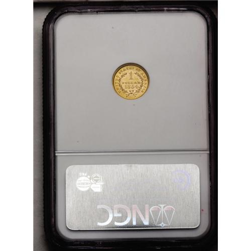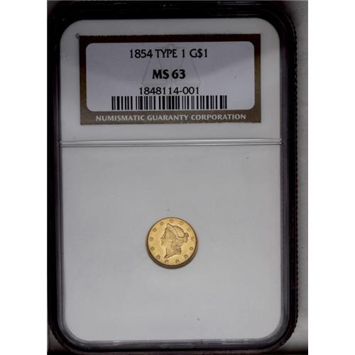 <B>1854<G$1> Type One MS63 NGC.</B></I> Intricately detailed and exhibiting an original, bright, satiny appearance, with very few abrasions for a coin of this grade. Die clash marks are noted on both sides.