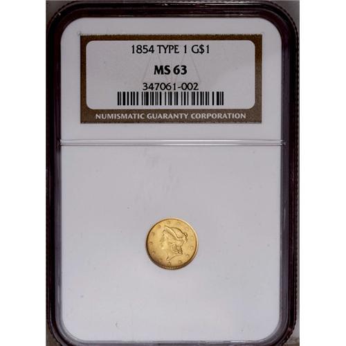 1854 G$1 Type One MS63 NGC. The reverse displays notic 1854[G$1] Type One MS63 NGC.