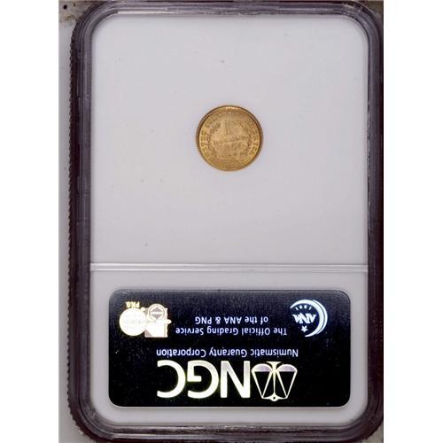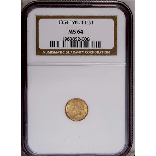 <B>1854<G$1> Type One MS64 NGC.</B></I> A lustrous and precisely struck green-gold and orange near-Gem. Only trivial marks are encountered. One of three transitional dates for gold dollar designs, along with 1849 and 1856.