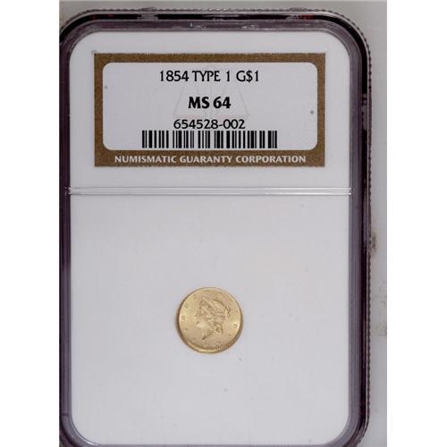 1854 G$1 Type One MS64 NGC. Boldly struck, if typicall