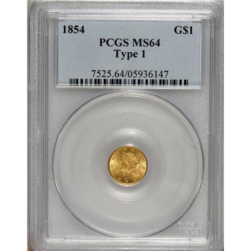 <B>1854 G$1 Type One MS64 PCGS.</B></I> Slightly dusky amber-gold color with a touch of frosty luster characterizes this final Type One Philadelphia issue. Carefully preserved with only minor flaws evident in the fields.<BR><BR><b>Shipping:</b> Coins & Currency (<a target="_blank" href="http://www.heritageauctions.com/common/shipping.php">view shipping information</a>)