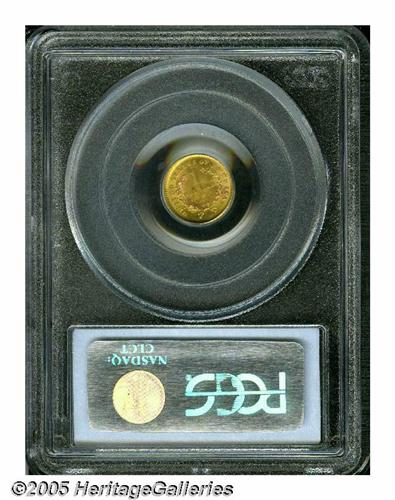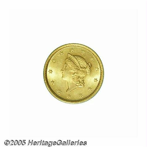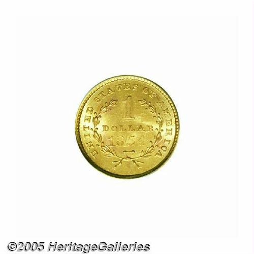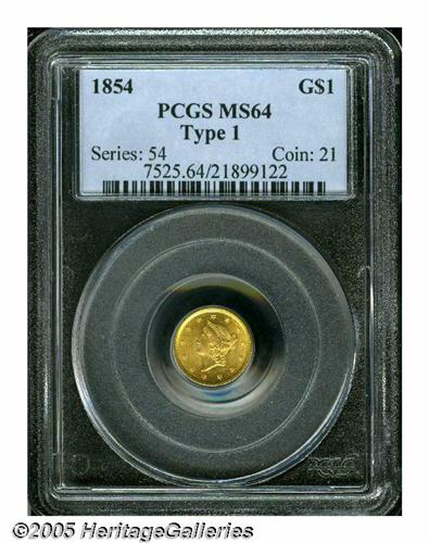 <B>1854<G$1> Type One MS64 PCGS.</B></I> We see no reason for this coin to be in the holder it is in, for in our opinion, it clearly meets the standard criteria for the MS65 grade. It is a sharply struck example with bright and frosty yellow luster, and hints of pinkish toning, especially on the reverse. The surfaces have only the slightest of marks on each side. When looking at this coin, consider the standards published by PCGS in <I>The Official Guide to Coin Grading:</B></I> "There may be some scattered marks, hairlines, or other minor defects. If the flaws are in a main focal area, they must be minor and few. ... The coin will be well-struck. ... The luster will be at least average, and any toning can only slightly impede the luster. ... The eye appeal will be average or above." Although there may be just a few too many tiny marks, the luster and eye appeal more than make up.