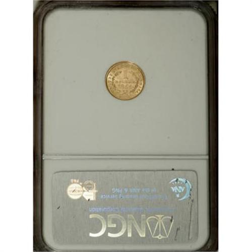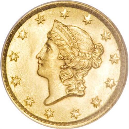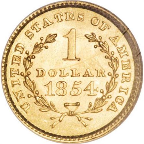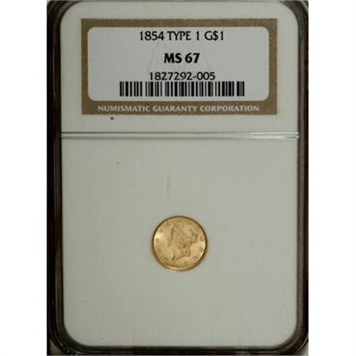 <B>1854 G$1 Type One MS67 NGC.</B></I> The mintage for the 1854 gold dollar is not as large as the preceding three P-mint gold dollar deliveries; however, the 1854 still boasts a respectable mintage of 855,502 pieces. It is not surprising, therefore, that this issue remains popular among type collectors who desire an attractive representative of James Longacre's Type One design. While the average collector would happily settle for an MS64 or MS65 example, gold specialists who pride themselves on unrivaled numismatic beauty really need to see this Superb Gem. Sharply defined in almost all areas, the surfaces exude a rich cartwheel mint frost that is very attractive. The coin also displays bright yellow-gold coloration, and the only noticeable ripples in the fabric of the coin are die clash marks in the fields. Very attractive and very desirable as a type coin in Superb condition. Census: 7 in 67, 0 finer (1/08).<BR><I>From The Southwest Collection.</B></I><BR><BR><B>Coin Engraver:</B> James B. Longacre<BR><BR><b>Shipping:</b> Coins & Currency (<a target="_blank" href="http://www.heritageauctions.com/common/shipping.php">view shipping information</a>)