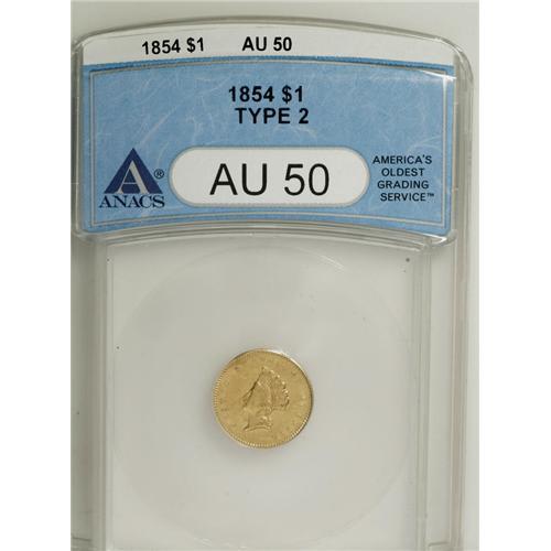 <B>1854 G$1 Type Two AU50 ANACS.</B></I> NGC Census: (332/8152). PCGS Population (332/2173). Mintage: 783,943. Numismedia Wsl. Price for NGC/PCGS coin in AU50: $480. (#7531)<BR><BR><b>Shipping:</b> Coins & Currency (<a target="_blank" href="http://www.heritageauctions.com/common/shipping.php">view shipping information</a>)