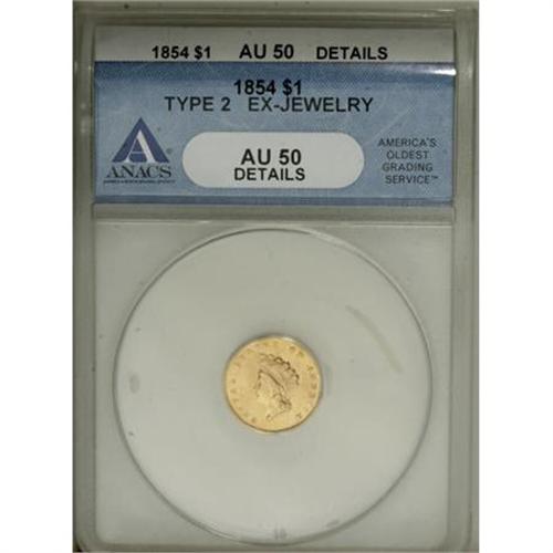 <B>1854 G$1 Type Two--Ex-Jewelry--ANACS. AU50 Details.</B></I> NGC Census: (167/4278). PCGS Population (333/2252). Mintage: 783,943. Numismedia Wsl. Price for NGC/PCGS coin in AU50: $480. (#7531)<BR><BR><B>Coin Engraver:</B> James B. Longacre<BR><BR><b>Shipping:</b> Coins & Currency (<a target="_blank" href="http://www.heritageauctions.com/common/shipping.php">view shipping information</a>)