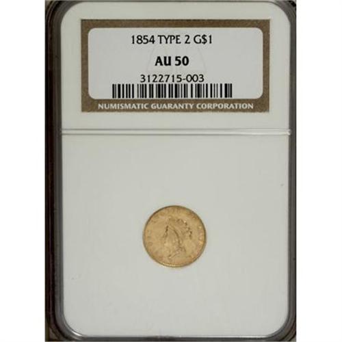 <B>1854 G$1 Type Two AU50 NGC.</B></I> NGC Census: (169/4349). PCGS Population (333/2310). Mintage: 783,943. Numismedia Wsl. Price for NGC/PCGS coin in AU50: $485. (#7531)<BR><BR><B>Coin Engraver:</B> James B. Longacre<BR><BR><b>Shipping:</b> Coins & Currency (<a target="_blank" href="http://www.heritageauctions.com/common/shipping.php">view shipping information</a>)