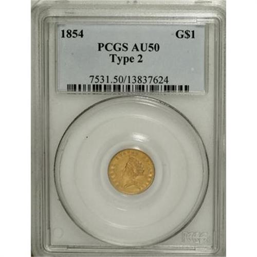 <B>1854 G$1 Type Two AU50 PCGS.</B></I> Luster brightens all protected areas, and the dusky orange and green-gold toning appears original. There are no remotely consequential marks.<BR><I>From The Pearl E. Pemberton Collection.</B></I><BR><BR><B>Coin Engraver:</B> James B. Longacre<BR><BR><b>Shipping:</b> Coins & Currency (<a target="_blank" href="http://www.heritageauctions.com/common/shipping.php">view shipping information</a>)
