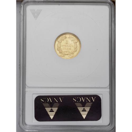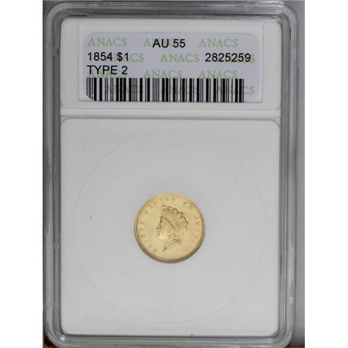 1854 G$1 Type Two AU55 ANACS. Light straw-gold toning 1854[G$1] Type Two AU55 ANACS.