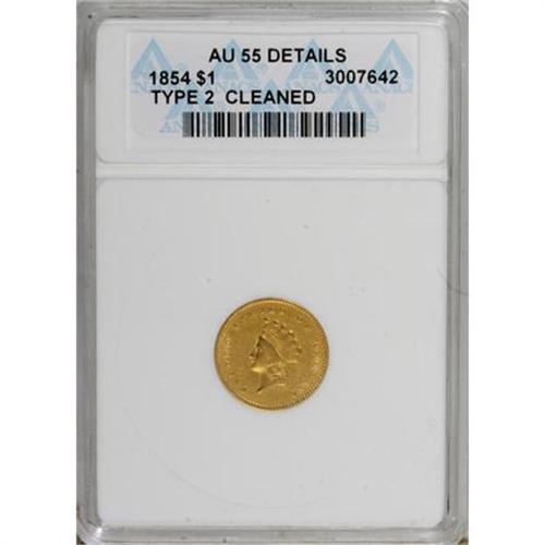 <B>1854 G$1 Type Two--Cleaned--ANACS. AU55 Details.</B></I> NGC Census: (693/3254). PCGS Population (464/1513). Mintage: 783,943. Numismedia Wsl. Price for NGC/PCGS coin in AU55: $680. (#7531)<BR><BR><B>Coin Engraver:</B> James B. Longacre<BR><BR><b>Shipping:</b> Coins & Currency (<a target="_blank" href="http://www.heritageauctions.com/common/shipping.php">view shipping information</a>)