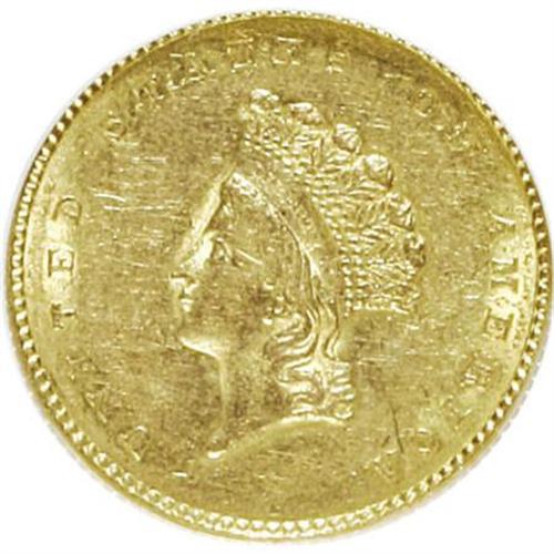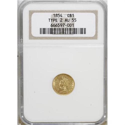 <B>1854 G$1 Type Two AU55 NGC.</B></I> NGC Census: (712/3389). PCGS Population (474/1588). Mintage: 783,943. Numismedia Wsl. Price for NGC/PCGS coin in AU55: $680. (#7531)<BR><BR><B>Coin Engraver:</B> James B. Longacre<BR><BR><b>Shipping:</b> Coins & Currency (<a target="_blank" href="http://www.heritageauctions.com/common/shipping.php">view shipping information</a>)