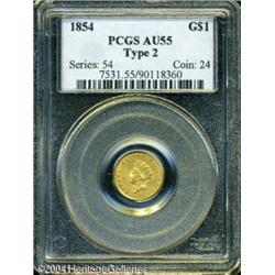 1854 G$1 Type Two AU55 PCGS. Straw-gold patina wit <B>1854 G$1 Type Two AU55 PCGS.</B></I> Straw-gold patina with a hint of red, especially on the reverse. Nicely struck, with just a few light marks on Liberty's cheek. <BR><BR><B>Important notice:</B> Heritage usually auctions material at the rate of 200-250 lots per hour. On some occasions eBay Live bid software or the Internet may not be able to keep up with the pace of the auction. We recommend placing a realistic absentee bid now as insurance to avoid disappointment. Occasionally the auctioneer may eliminate or reject an eBay Live bid, and the auctioneer may also reopen a lot after the close of the eBay live bidding (usually because we missed an audience bid), and may reject your bid even if it shows you as the winning bidder. By bidding via eBay Live, you agree that Heritage may award the lot to another bidder at its sole discretion under the circumstances described above or any other reasonable circumstances. Since eBay bids are not shown to us until we open the lot on the floor, we treat those bids just like floor bids. In most cases the floor responds before the eBay bid is presented to us, due to Internet lag time, so for consistency we have made it a policy that floor bids are always considered first over tie eBay live bids. Also please note that all Heritage lots purchased through eBay Live carry a 20% Buyer's Premium. Please make sure you read the Terms and Conditions before you bid. This lot is being auctioned in conjunction with a live floor auction by Heritage Galleries & Auctioneers. All final auction and invoice information will be supplied by Heritage Galleries & Auctioneers, and all other information should be considered preliminary. Lot:6443