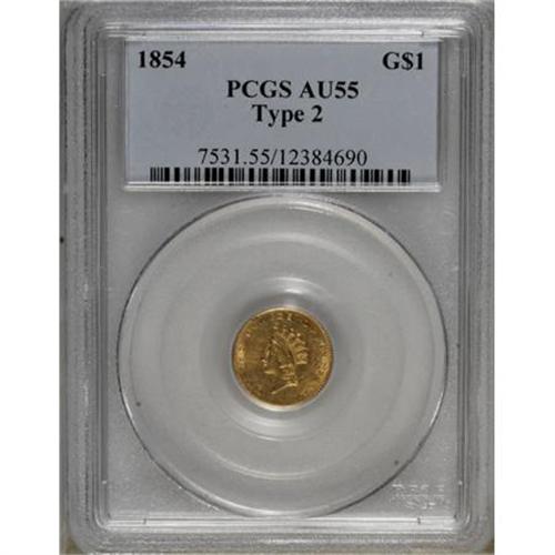 <B>1854 G$1 Type Two AU55 PCGS.</B></I> PCGS Population (474/1595). NGC Census: (713/3399). Mintage: 783,943. Numismedia Wsl. Price for NGC/PCGS coin in AU55: $680. (#7531)<BR><BR><B>Coin Engraver:</B> James B. Longacre<BR><BR><b>Shipping:</b> Coins & Currency (<a target="_blank" href="http://www.heritageauctions.com/common/shipping.php">view shipping information</a>)
