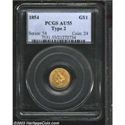 <TABLE cellSpacing=0 cellPadding=0 width="100%" bgColor=#000000 border=0><TBODY><TR><TD width="100%"><TABLE cellSpacing=1 cellPadding=3 width="100%" border=0><TBODY><TR><TD width="100%" bgColor=#79735c><FONT face=arial color=#ffffff size=3><B>Description</B> </FONT></TD></TR><TR><TD width="100%" bgColor=#ffffff><FONT face=arial size=2><B>1854 G$1 Type Two AU55 PCGS.</B></I> Abundant luster fills the legends and devices. A small mint-made planchet flaw is noted below Liberty's eye, but the surfaces are refreshingly free from untoward contact. Scarce as a type coin. Struck from clashed dies. </FONT></TD></TR></TBODY></TABLE></TD></TR></TBODY></TABLE><BR><A name=PricesRealized></A><TABLE cellSpacing=0 cellPadding=0 width="100%" bgColor=#000000 border=0><TBODY><TR><TD width="100%"><TABLE cellSpacing=1 cellPadding=3 width="100%" border=0><TBODY><TR><TD width="100%" bgColor=#79735c><A name=PR><FONT face=arial color=#ffffff size=3><B>Previous Prices from Heritage Auctions</B> </FONT></A></TD></TR><TR><TD bgColor=#f6f6ed><TABLE cellSpacing=0 cellPadding=0 width="100%" border=1><TBODY><TR><TD align=middle width="33%"><B>Date</B></TD><TD align=middle width="33%"><B>Service</B></TD><TD align=middle width="33%"><B>Price</B></TD></TR><TR bgColor=whitesmoke><TD width="33%"><B>07/16/2002</B></TD><TD width="33%">NGC</TD><TD width="33%">$718.75</TD></TR><TR bgColor=whitesmoke><TD width="33%"><B>07/24/2001</B></TD><TD width="33%">NGC</TD><TD width="33%">$650.00</TD></TR><TR bgColor=whitesmoke><TD width="33%"><B>01/02/2001</B></TD><TD width="33%">NGC</TD><TD width="33%">$575.00</TD></TR><TR bgColor=whitesmoke><TD width="33%"><B>10/04/1997</B></TD><TD width="33%">NGC</TD><TD width="33%">$495.00</TD></TR><TR bgColor=whitesmoke><TD width="33%"><B>09/30/2002</B></TD><TD width="33%">PCGS</TD><TD width="33%">$776.25</TD></TR><TR bgColor=whitesmoke><TD width="33%"><B>01/07/1998</B></TD><TD width="33%">PCGS</TD><TD width="33%">$528.00</TD></TR><TR bgColor=whitesmoke><TD width="33%"><B>08/05/2001</B></TD><TD width="33%">ANACS</TD><TD width="33%">$552.00</TD></TR><TR bgColor=whitesmoke><TD width="33%"><B>11/07/2000</B></TD><TD width="33%">NGC</TD><TD width="33%">$490.00</TD></TR><TR bgColor=whitesmoke><TD width="33%"><B>07/22/2003</B></TD><TD width="33%">PCGS</TD><TD width="33%">$747.50</TD></TR><TR bgColor=whitesmoke><TD width="33%"><B>06/03/1998</B></TD><TD width="33%">NGC</TD><TD width="33%">$462.00</TD></TR><TR bgColor=whitesmoke><TD width="33%"><B>04/24/1998</B></TD><TD width="33%">PCGS</TD><TD width="33%">$632.50</TD></TR><TR bgColor=whitesmoke><TD width="33%"><B>05/01/1995</B></TD><TD width="33%">PCGS</TD><TD width="33%">$1,210.00</TD></TR><TR bgColor=whitesmoke><TD width="33%"><B>05/13/2003</B></TD><TD width="33%">NGC</TD><TD width="33%">$661.25</TD></TR><TR bgColor=whitesmoke><TD width="33%"><B>03/04/2003</B></TD><TD width="33%">NGC</TD><TD width="33%">$690.00</TD></TR><TR bgColor=whitesmoke><TD width="33%"><B>02/13/1999</B></TD><TD width="33%">ANACS</TD><TD width="33%">$522.50</TD></TR></TBODY></TABLE></TD></TR><TR><TD bgColor=#ffffff><FONT face=arial size=1 ?>PLEASE NOTE: All prices realized reflect the final hammer price PLUS the buyer's premium in auctions that charge a buyer's premium. Each item has a notation at the top of the listing indicating whether that lot included a buyer's premium. Example: A item that sells with a final hammer price of $100 and a 20% buyer's premium will display with a price realized of $120. All information listed is intended to be as accurate as possible, but errors are possible. Please use this guide carefully and inform us of any inaccuracies. </FONT></TD></TR></TBODY></TABLE></TD></TR></TBODY></TABLE><BR><TABLE cellSpacing=0 cellPadding=0 width="100%" bgColor=#000000 border=0><TBODY><TR><TD width="100%"><TABLE cellSpacing=1 cellPadding=3 width="100%" border=0><TBODY><TR><TD width="100%" bgColor=#79735c colSpan=6><FONT face=arial color=#ffffff size=3><B>Price Guide*</B> </FONT></TD></TR><TR bgColor=#f6f6ed><TD align=middle><B>Grade</B> </TD><TD align=middle><B>Coin World<BR>(Trends)</B> </TD><TD align=middle><B>Numismedia<BR>Retail</B> </TD><TD align=middle><B>Numismedia<BR>Wholesale</B> </TD><TD align=middle><B>Coin<BR>Universe</B> </TD><TD align=middle><B>Heritage<BR>Value Index</B> </TD></TR><TR bgColor=#ffffff><TD align=middle>53</TD><TD align=right>---</TD><TD align=right>$630.00</TD><TD align=right>$500.00</TD><TD align=right>---</TD><TD align=right>$660.69</TD></TR><TR style="FONT-WEIGHT: bold" bgColor=#cccfdd><TD align=middle>55</TD><TD align=right>$1,100.00</TD><TD align=right>$760.00</TD><TD align=right>$610.00</TD><TD align=right>$825.00</TD><TD align=right>$856.56</TD></TR><TR bgColor=#ffffff><TD align=middle>58</TD><TD align=right>$1,500.00</TD><TD align=right>---</TD><TD align=right>$1,125.00</TD><TD align=right>---</TD><TD align=right>$1,320.75</TD></TR><TR bgColor=#ffffff><TD colSpan=6><FONT size=1>*All information listed is intended to be as accurate as possible, but errors are possible. No item may be returned or refused based on this information which is provided as a service to our customers. You should contact each pricing source directly to determine the accuracy of this information. </FONT></TD></TR></TBODY></TABLE></TD></TR></TBODY></TABLE><BR><TABLE cellSpacing=0 cellPadding=0 width="100%" bgColor=#000000 border=0><TBODY><TR><TD width="100%"><TABLE cellSpacing=1 cellPadding=3 width="100%" border=0><TBODY><TR><TD width="100%" bgColor=#79735c><FONT face=arial color=#ffffff size=3><B>Population Guide</B> </FONT></TD></TR><TR bgColor=#ffffff><TD align=middle><!-- Begin Output of Population Grid--><TABLE cellSpacing=0 cellPadding=0 width="100%" border=0><TBODY><TR><TD vAlign=center><TABLE cellSpacing=0 width="100%" border=1 cellsadding="3"><TBODY><TR><TD vAlign=center><TABLE cellSpacing=0 cellPadding=3 width="100%" border=1><TBODY><TR><TD vAlign=center align=middle bgColor=#f0f1e8 colSpan=2 <CENTER><FONT face=Arial size=2><B>PCGS Pop </B></FONT><CENTER