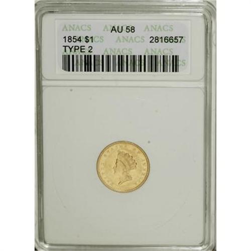 <B>1854 G$1 Type Two AU58 ANACS.</B></I> NGC Census: (1953/1436). PCGS Population (467/1121). Mintage: 783,943. Numismedia Wsl. Price for NGC/PCGS coin in AU58: $925. (#7531)<BR><BR><B>Coin Engraver:</B> James B. Longacre<BR><BR><b>Shipping:</b> Coins & Currency (<a target="_blank" href="http://www.heritageauctions.com/common/shipping.php">view shipping information</a>)