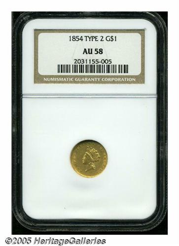 <B>1854<G$1> Type Two AU58 NGC.</B></I> A nearly Mint State example of this scarce type. Sharply struck with typical die clashing (as made) on each side, and only a trace of wear.