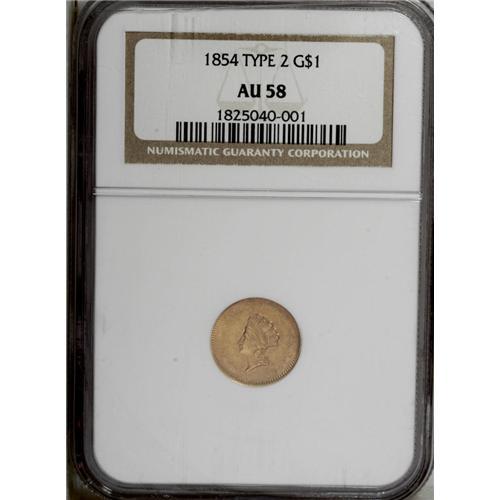 1854 G$1 Type Two AU58 NGC. A pleasing pumpkin-gold pi