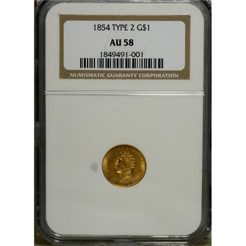 1854 G$1 Type Two AU58 NGC. Attractive yellow-gold pat
