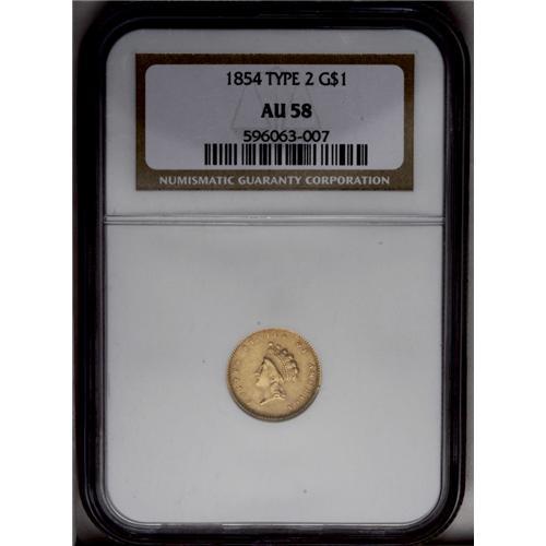<B>1854<G$1> Type Two AU58 NGC.</B></I> Better struck than usual through the centers, and with largely pristine golden-brown surfaces. Light clash marks are noted on the reverse.