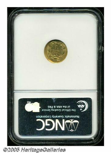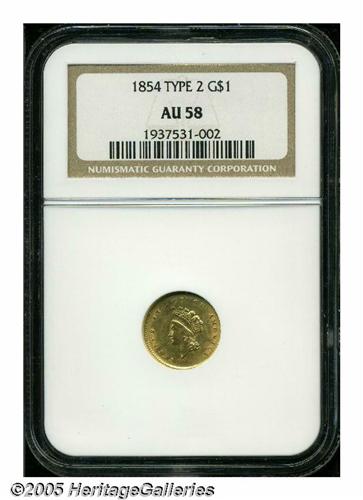 <B>1854<G$1> Type Two AU58 NGC.</B></I> Luster fills the margins of this crisply struck piece. Clash marks are present, as usual for the type, but are relatively faint. A tapered planchet (as made) causes weakness of design at 11 o'clock on the obverse and opposite at 7 o'clock on the reverse.