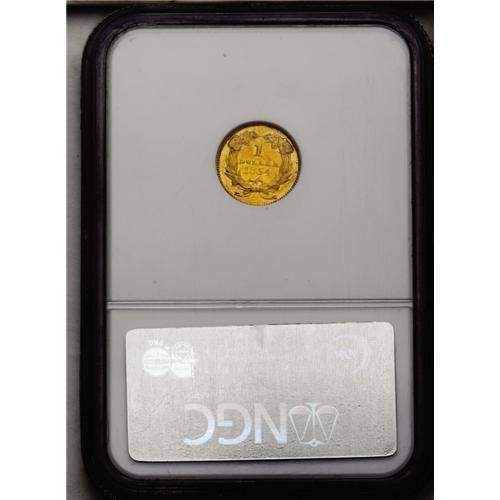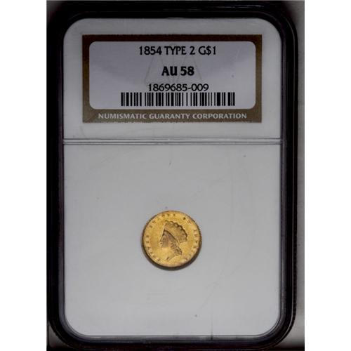 <B>1854<G$1> Type Two AU58 NGC.</B></I> Lustrous honey-gold surfaces with prominent clash marks on both sides. The surfaces are lightly abraded, and a trace of wear is noted on the highest design points with darker toning at these locations.