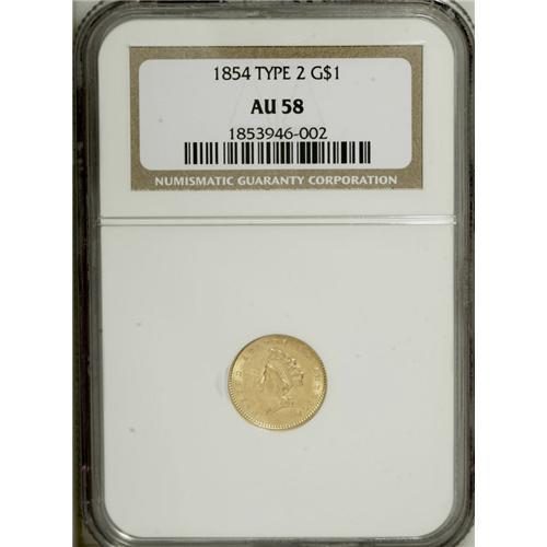 1854 G$1 Type Two AU58 NGC. The luster is only slightl
