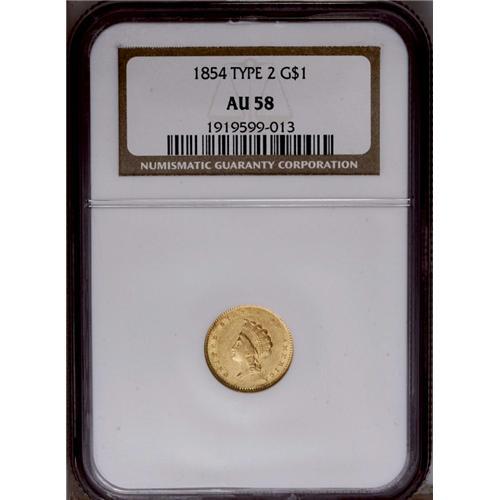 1854 G$1 Type Two AU58 NGC. This pale tan-gold example 1854[G$1] Type Two AU58 NGC.