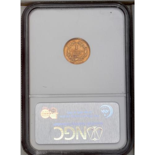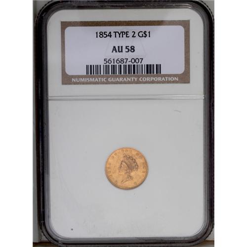 <B>1854<G$1> Type Two AU58 NGC.</B></I> Traces of highpoint friction scarcely impede the luster of this Type Two gold dollar. The green-gold devices are nicely detailed.