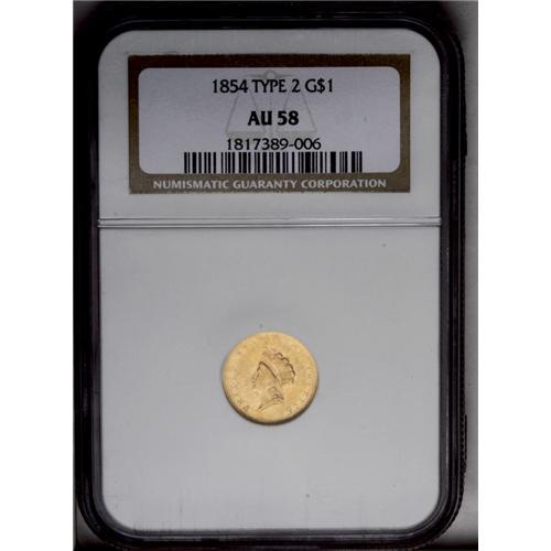 <B>1854<G$1> Type Two AU58 NGC.</B></I> Typically struck through the centers, with only light abrasions on each side, and pleasing copper-gold surfaces.