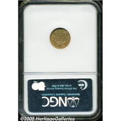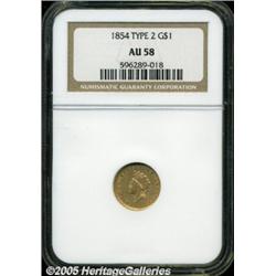 <B>1854 G$1 Type Two AU58 NGC.</B></I> Varying shades of tan-gold patina overlay relatively clean surfaces. Some softness in noted in Liberty's hair.