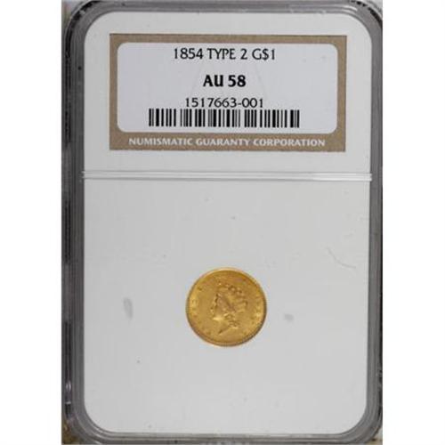 <B>1854 G$1 Type Two AU58 NGC.</B></I> Pleasingly lustrous with just a trace of friction on Liberty's hair detail that keeps it from a Mint State holder. The khaki-gold surfaces display normal clash marks on each side, but few blemishes. A small rim abrasion is noted near 9 o'clock on the obverse of this appealing type coin. <BR><BR><B>Coin Engraver:</B> James B. Longacre<BR><BR><b>Shipping:</b> Coins & Currency (<a target="_blank" href="http://www.heritageauctions.com/common/shipping.php">view shipping information</a>)