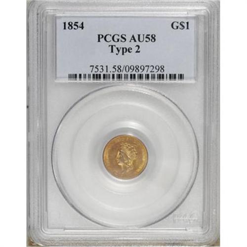 <B>1854 G$1 Type Two AU58 PCGS.</B></I> Both sides of this lovely near-Mint example have deep bluish patina over rich yellow luster. Only slight wear is evident on the design highpoints.<BR><BR><B>Coin Engraver:</B> James B. Longacre<BR><BR><b>Shipping:</b> Coins & Currency (<a target="_blank" href="http://www.heritageauctions.com/common/shipping.php">view shipping information</a>)