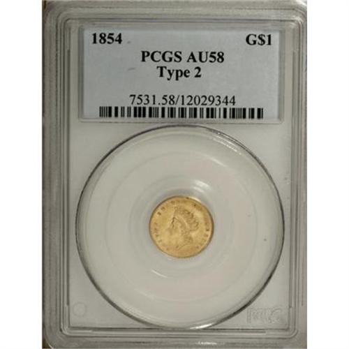<B>1854 G$1 Type Two AU58 PCGS.</B></I> A luminous yellow-orange example of this first-year Type Two issue, well struck with just a touch of highpoint friction. Small, scattered marks are present in the fields.<BR><BR><B>Coin Engraver:</B> James B. Longacre<BR><BR><b>Shipping:</b> Coins & Currency (<a target="_blank" href="http://www.heritageauctions.com/common/shipping.php">view shipping information</a>)