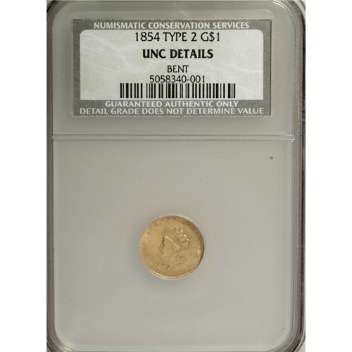 <B>1854 G$1 Type Two--Bent--NCS. Unc Details.</B></I> NGC Census: (166/4076). PCGS Population (332/2173). Mintage: 783,943. Numismedia Wsl. Price for NGC/PCGS coin in AU50: $480. (#7531)<BR><BR><b>Shipping:</b> Coins & Currency (<a target="_blank" href="http://www.heritageauctions.com/common/shipping.php">view shipping information</a>)