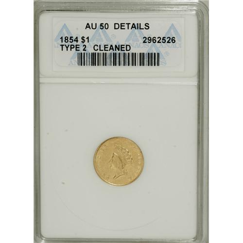 <B>1854 G$1 Type Two--Cleaned--ANACS. AU50 Details.</B></I> NGC Census: (165/4041). PCGS Population (332/2201). Mintage: 783,943. Numismedia Wsl. Price: $480. (#7531)<BR><BR><b>Shipping:</b> Coins & Currency (<a target="_blank" href="http://www.heritageauctions.com/common/shipping.php">view shipping information</a>)