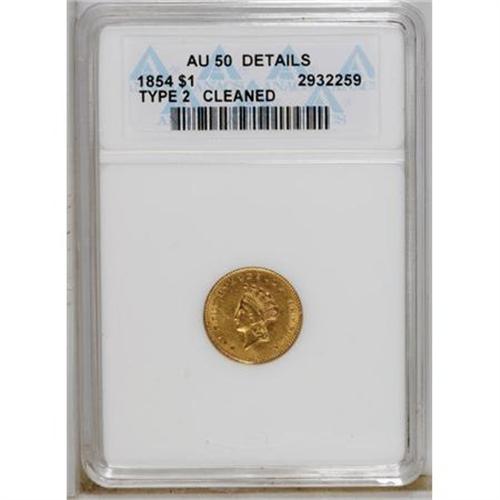 <B>1854 G$1 Type Two--Cleaned--ANACS. AU50 Details.</B></I> NGC Census: (166/4114). PCGS Population (331/2173). Mintage: 783,943. Numismedia Wsl. Price for NGC/PCGS coin in AU50: $480. (#7531)<BR><BR><b>Shipping:</b> Coins & Currency (<a target="_blank" href="http://www.heritageauctions.com/common/shipping.php">view shipping information</a>)