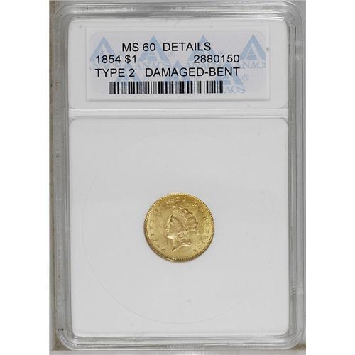 <B>1854<G$1> Type Two--Damaged, Bent--ANACS. MS60 Details.</B></I> Despite significant, damaging abrasions and a slight bend, this piece has no trace of wear. Sharply struck with yellow-gold surfaces that display strong luster.