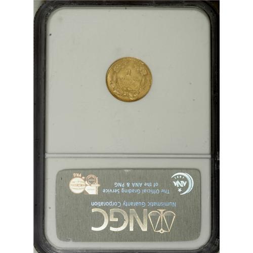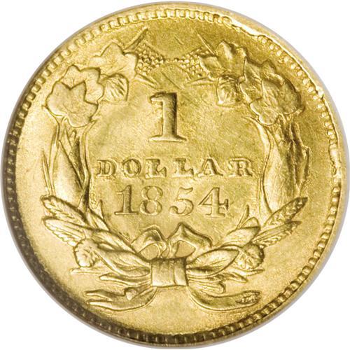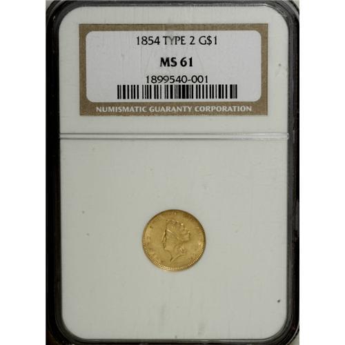 <B>1854 G$1 Type Two MS61 NGC.</B></I> A nicely lustrous and refreshingly smooth green-gold example of this difficult gold type. The highpoints show slight incompleteness of detail, but the strike is generally crisp. Minor marks near the top of the wreath and coronet are of little importance. The reverse has rim die breaks at 1 and 3 o'clock.<BR><BR><b>Shipping:</b> Coins & Currency (<a target="_blank" href="http://www.heritageauctions.com/common/shipping.php">view shipping information</a>)