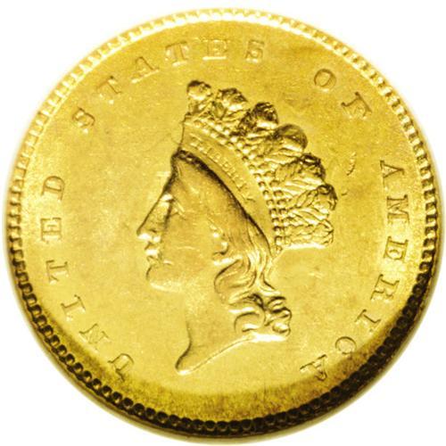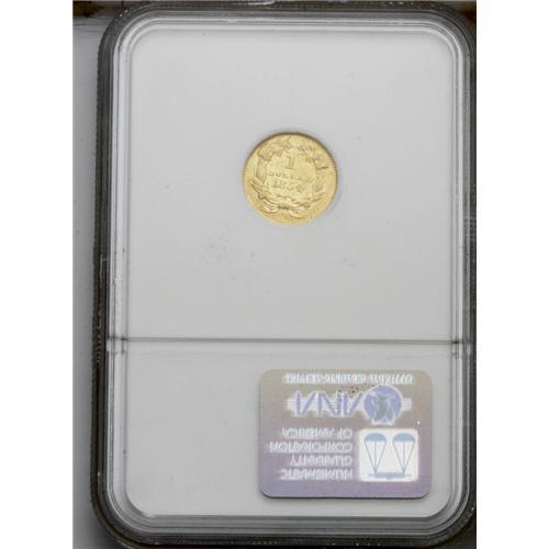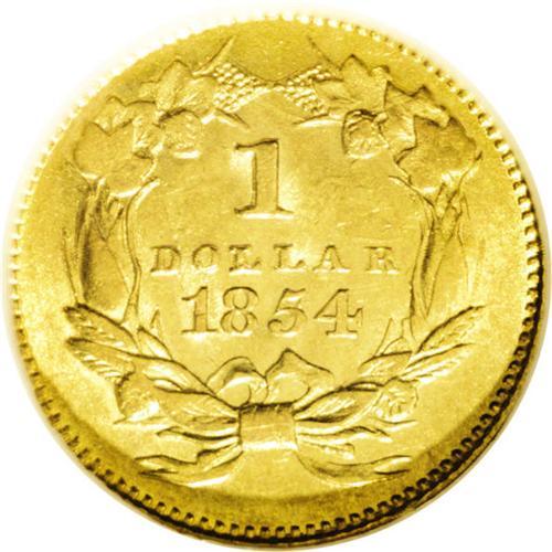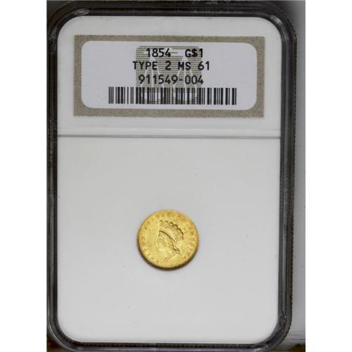 <B>1854<G$1> Type Two MS61 NGC.</B></I> An Uncirculated quality Type Two gold dollar. Both sides are above average in striking definition, with only minimal softness of detail over the central obverse highpoint. The copper-tinged surfaces warm to orange-gold shades at direct angles. The number of scattered abrasions is uncommonly minimal for the assigned grade, but we do note that the often-seen clash marks are present in the fields around the central devices.<BR><I>From The Chief Paduke Collection.</B></I>