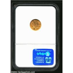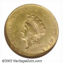 1854 G$1 Type Two MS61 NGC. An attractive representative of this conditionally challenging type, both sides display reddish-gold color with more deeply set green-gold undertones. The strike is average for the type, but all major design elements are sufficiently bold. Neither side is excessively abraded for the MS61 grade level, and the often seen clashmarks (as struck) in the reverse field are noted. The reverse die was rotated several degrees clockwise in relation to the obverse at the time of striking. Important notice: We expect to be auctioning lots at the rate of 200-250 per hour. Sometimes eBay Premier live bid software cannot keep up with that pace, so we strongly recommend that you place a realistic proxy bid now as insurance to avoid disappointment. Also please note that all Heritage/CAA lots purchased through eBay Premier carry a 20% Buyer's Premium. Please make sure you read the Terms and Conditions.