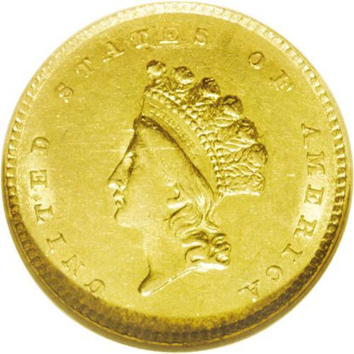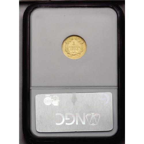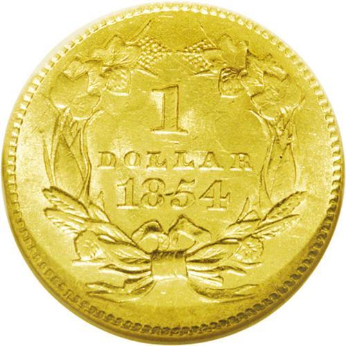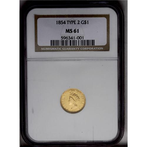 <B>1854<G$1> Type Two MS61 NGC.</B></I> Sharply defined throughout, save for the highpoint of Liberty's hair, with an overlay of light golden patina. A few small abrasions, and a slightly subdued appearance account for the MS61 grade. Always popular as a short-lived type gold coin.