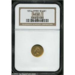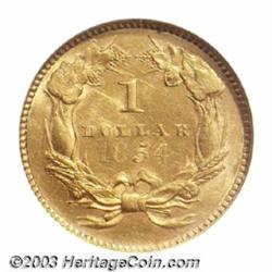 <table><tr><td><TABLE cellSpacing=0 cellPadding=0 width="100%" bgColor=#000000 border=0><TBODY> <TR><TD width="100%"><TABLE cellSpacing=1 cellPadding=3 width="100%" border=0><TBODY><TR><TD width="100%" bgColor=#79735c><FONT face=arial color=#ffffff size=3><B>Description</B> </FONT></TD></TR><TR><TD width="100%" bgColor=#ffffff><FONT face=arial size=2><B>1854 G$1 Type Two MS61 NGC.</B></I> First year of a three-year type, and a very popular issue for type collectors, this piece has only slight softness in the centers, as seen on many Type Two gold dollars. The surfaces are completely original and show lovely rose and lilac patina over each side. The grade seems to come primarily from a number of shallow planchet flakes on the obverse. </FONT></TD></TR></TBODY></TABLE></TD></TR></TBODY></TABLE><BR><A name=PricesRealized></A><TABLE cellSpacing=0 cellPadding=0 width="100%" bgColor=#000000 border=0><TBODY><TR><TD width="100%"><TABLE cellSpacing=1 cellPadding=3 width="100%" border=0><TBODY><TR><TD width="100%" bgColor=#79735c><A name=PR><FONT face=arial color=#ffffff size=3><B>Previous Prices from Heritage Auctions</B> </FONT></A></TD></TR><TR><TD bgColor=#f6f6ed><TABLE cellSpacing=0 cellPadding=0 width="100%" border=1><TBODY><TR><TD align=middle width="33%"><B>Date</B></TD><TD align=middle width="33%"><B>Service</B></TD><TD align=middle width="33%"><B>Price</B></TD></TR><TR bgColor=whitesmoke><TD width="33%"><B>01/11/2003</B></TD><TD width="33%">NGC</TD><TD width="33%">$3,565.00</TD></TR><TR bgColor=whitesmoke><TD width="33%"><B>09/28/2002</B></TD><TD width="33%">PCGS</TD><TD width="33%">$2,990.00</TD></TR><TR bgColor=whitesmoke><TD width="33%"><B>10/06/2001</B></TD><TD width="33%">PCGS</TD><TD width="33%">$4,140.00</TD></TR><TR bgColor=whitesmoke><TD width="33%"><B>01/07/2000</B></TD><TD width="33%">PCGS</TD><TD width="33%">$12,075.00</TD></TR><TR bgColor=whitesmoke><TD width="33%"><B>01/07/1998</B></TD><TD width="33%">NGC</TD><TD width="33%">$2,772.00</TD></TR><TR bgColor=whitesmoke><TD width="33%"><B>06/07/1997</B></TD><TD width="33%">PCGS</TD><TD width="33%">$3,245.00</TD></TR><TR bgColor=whitesmoke><TD width="33%"><B>02/02/1994</B></TD><TD width="33%">NGC</TD><TD width="33%">$2,035.00</TD></TR><TR bgColor=whitesmoke><TD width="33%"><B>05/01/1999</B></TD><TD width="33%">PCGS</TD><TD width="33%">$9,200.00</TD></TR><TR bgColor=whitesmoke><TD width="33%"><B>06/01/1991</B></TD><TD width="33%">PCGS</TD><TD width="33%">$2,640.00</TD></TR><TR bgColor=whitesmoke><TD width="33%"><B>03/01/1994</B></TD><TD width="33%">PCGS</TD><TD width="33%">$2,530.00</TD></TR><TR bgColor=whitesmoke><TD width="33%"><B>02/01/1999</B></TD><TD width="33%">NGC</TD><TD width="33%">$4,370.00</TD></TR><TR bgColor=whitesmoke><TD width="33%"><B>09/01/1996</B></TD><TD width="33%">NGC</TD><TD width="33%">$3,300.00</TD></TR><TR bgColor=whitesmoke><TD width="33%"><B>01/01/1994</B></TD><TD width="33%">NGC</TD><TD width="33%">$2,420.00</TD></TR><TR bgColor=whitesmoke><TD width="33%"><B>10/02/2000</B></TD><TD width="33%">PCGS</TD><TD width="33%">$3,680.00</TD></TR></TBODY></TABLE></TD></TR><TR><TD bgColor=#ffffff><FONT face=arial size=1 ?>PLEASE NOTE: All prices realized reflect the final hammer price PLUS the buyer's premium in auctions that charge a buyer's premium. Each item has a notation at the top of the listing indicating whether that lot included a buyer's premium. Example: A item that sells with a final hammer price of $100 and a 20% buyer's premium will display with a price realized of $120. All information listed is intended to be as accurate as possible, but errors are possible. Please use this guide carefully and inform us of any inaccuracies. </FONT></TD></TR></TBODY></TABLE></TD></TR></TBODY></TABLE><BR><TABLE cellSpacing=0 cellPadding=0 width="100%" bgColor=#000000 border=0><TBODY><TR><TD width="100%"><TABLE cellSpacing=1 cellPadding=3 width="100%" border=0><TBODY><TR><TD width="100%" bgColor=#79735c colSpan=6><FONT face=arial color=#ffffff size=3><B>Price Guide*</B> </FONT></TD></TR><TR bgColor=#f6f6ed><TD align=middle><B>Grade</B> </TD><TD align=middle><B>Coin World<BR>(Trends)</B> </TD><TD align=middle><B>Numismedia<BR>Retail</B> </TD><TD align=middle><B>Numismedia<BR>Wholesale</B> </TD><TD align=middle><B>Coin<BR>Universe</B> </TD><TD align=middle><B>Heritage<BR>Value Index</B> </TD></TR><TR bgColor=#ffffff><TD align=middle>60</TD><TD align=right>$2,500.00</TD><TD align=right>---</TD><TD align=right>$2,625.00</TD><TD align=right>$2,600.00</TD><TD align=right>$2,055.63</TD></TR><TR style="FONT-WEIGHT: bold" bgColor=#cccfdd><TD align=middle>61</TD><TD align=right>---</TD><TD align=right>---</TD><TD align=right>$3,075.00</TD><TD align=right>$4,950.00</TD><TD align=right>$3,313.44</TD></TR><TR bgColor=#ffffff><TD align=middle>62</TD><TD align=right>$6,250.00</TD><TD align=right>---</TD><TD align=right>$4,750.00</TD><TD align=right>$6,250.00</TD><TD align=right>$4,500.00</TD></TR><TR bgColor=#ffffff><TD colSpan=6><FONT size=1>*All information listed is intended to be as accurate as possible, but errors are possible. No item may be returned or refused based on this information which is provided as a service to our customers. You should contact each pricing source directly to determine the accuracy of this information. </FONT></TD></TR></TBODY></TABLE></TD></TR></TBODY></TABLE><BR><TABLE cellSpacing=0 cellPadding=0 width="100%" bgColor=#000000 border=0><TBODY><TR><TD width="100%"><TABLE cellSpacing=1 cellPadding=3 width="100%" border=0><TBODY><TR><TD width="100%" bgColor=#79735c><FONT face=arial color=#ffffff size=3><B>Population Guide</B> </FONT></TD></TR><TR bgColor=#ffffff><TD align=middle><!-- Begin Output of Population Grid--><TABLE cellSpacing=0 cellPadding=0 width="100%" border=0><TBODY><TR><TD vAlign=center><TABLE cellSpacing=0 width="100%" border=1 cellsadding="3"><TBODY><TR><TD vAlign=center><TABLE cellSpacing=0 cellPadding=3 width="100%" border=1><TBODY><TR><TD vAlign=center align=middle bgColor=#f0f1e8 col