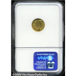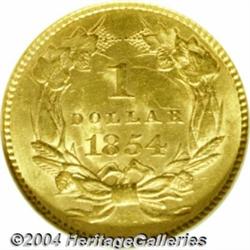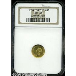 <B>1854<G$1> Type Two MS61 NGC.</B></I> The moderately abraded surfaces display ample eye appeal for the grade. The strike is average, but the yellow-gold luster is bright and bold. Struck from clashed dies, this is a nice representation of the popular Type Two design, and a fine choice for a Mint State gold type set. <BR><BR><B>Important notice:</B> Heritage usually auctions material at the rate of 200-250 lots per hour. On some occasions eBay Live bid software or the Internet may not be able to keep up with the pace of the auction. We recommend placing a realistic absentee bid now as insurance to avoid disappointment. Occasionally the auctioneer may eliminate or reject an eBay Live bid, and the auctioneer may also reopen a lot after the close of the eBay live bidding (usually because we missed an audience bid), and may reject your bid even if it shows you as the winning bidder. By bidding via eBay Live, you agree that Heritage may award the lot to another bidder at its sole discretion under the circumstances described above or any other reasonable circumstances. Since eBay bids are not shown to us until we open the lot on the floor, we treat those bids just like floor bids. In most cases the floor responds before the eBay bid is presented to us, due to Internet lag time, so for consistency we have made it a policy that floor bids are always considered first over tie eBay live bids. Also please note that all Heritage lots purchased through eBay Live carry a 20% Buyer's Premium. Please make sure you read the Terms and Conditions before you bid. </span></font></tr></table></td></tr></table>