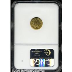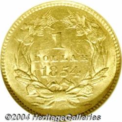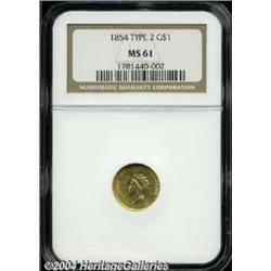 <B>1854<G$1> Type Two MS61 NGC.</B></I> Apricot-gold patina varies slightly in hue as the coin is tilted under a light. The design elements are nicely struck, though the Indian's hair lacks some detail. A few scattered marks are observed over the obverse, the most notable being located on the cheek. <BR><BR><B>Important notice:</B> Heritage usually auctions material at the rate of 200-250 lots per hour. On some occasions eBay Live bid software or the Internet may not be able to keep up with the pace of the auction. We recommend placing a realistic absentee bid now as insurance to avoid disappointment. Occasionally the auctioneer may eliminate or reject an eBay Live bid, and the auctioneer may also reopen a lot after the close of the eBay live bidding (usually because we missed an audience bid), and may reject your bid even if it shows you as the winning bidder. By bidding via eBay Live, you agree that Heritage may award the lot to another bidder at its sole discretion under the circumstances described above or any other reasonable circumstances. Since eBay bids are not shown to us until we open the lot on the floor, we treat those bids just like floor bids. In most cases the floor responds before the eBay bid is presented to us, due to Internet lag time, so for consistency we have made it a policy that floor bids are always considered first over tie eBay live bids. Also please note that all Heritage lots purchased through eBay Live carry a 20% Buyer's Premium. Please make sure you read the Terms and Conditions before you bid. </span></font></tr></table></td></tr></table>