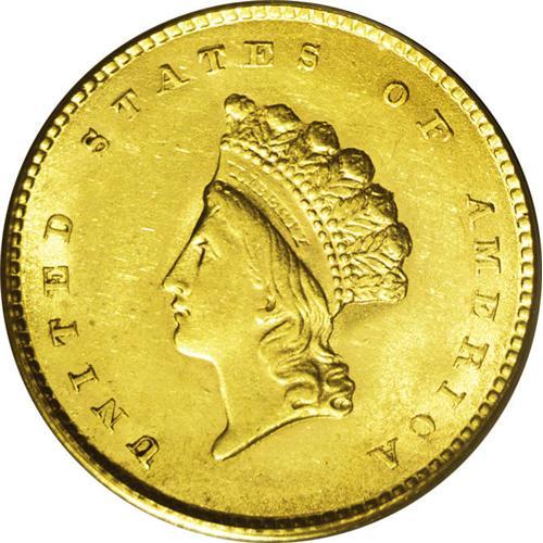 <B>1854<G$1> Type Two MS61 PCGS.</B></I> In addition to the Mint State grade, what gives this piece singular distinction is the sharpness of strike in the centers. The reverse is especially strong with complete digits in the date and the LL in DOLLAR. The yellow-gold color usually seen on Type Two gold dollars shows a slight accent of orange-gold around the margins.