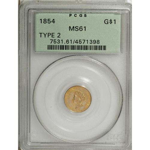 <B>1854 G$1 Type Two MS61 PCGS.</B></I> This is a lovely Mint State gold dollar, with semi-reflective fields and enticing apricot-orange, lilac, and steel-gray toning intermingled over the nicely preserved surfaces. Die clash marks are slight on the obverse, and moderate on the reverse. Wispy field marks and faint hairlines limit the grade. In a green label holder.<BR><BR><b>Shipping:</b> Coin/Currency (<a target="_blank" href="http://www.heritageauctions.com/common/shipping.php">view shipping information</a>)