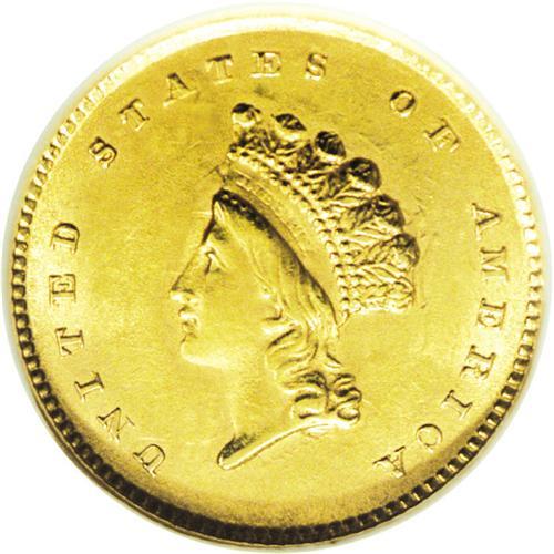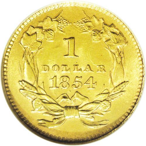 <B>1854<G$1> Type Two MS62 NGC.</B></I> An assertively struck Uncirculated example of this desired type. Even the O in DOLLAR and the 8 in the date, often vaguely defined, are bold on the present piece. Full satin luster bathes the open fields, and both sides have far fewer than the usual number of abrasions. A short, hair-thin diagonal slide mark on the cheekbone perhaps prevents a higher grade. Struck from moderately clashed dies.