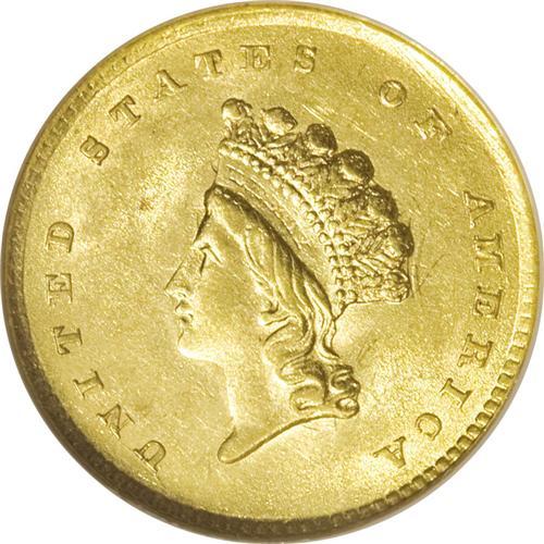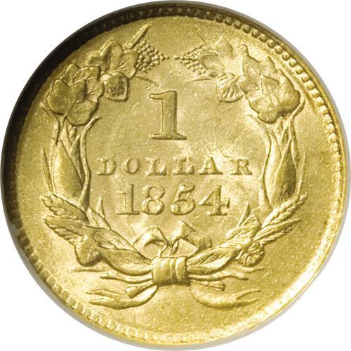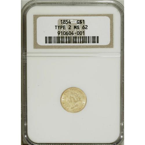 <B>1854 G$1 Type Two MS62 NGC.</B></I> Luster dominates the open fields, which are only lightly abraded for the MS62 level. Crisply struck aside from the denticles, which are generally soft. Slightly wavy near Liberty's chin. Type Two gold dollars were struck at Philadelphia for only two years, although San Francisco made a belated contribution to the type in 1856.<BR><BR><b>Shipping:</b> Coin/Currency (<a target="_blank" href="http://www.heritageauctions.com/common/shipping.php">view shipping information</a>)