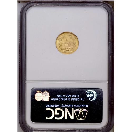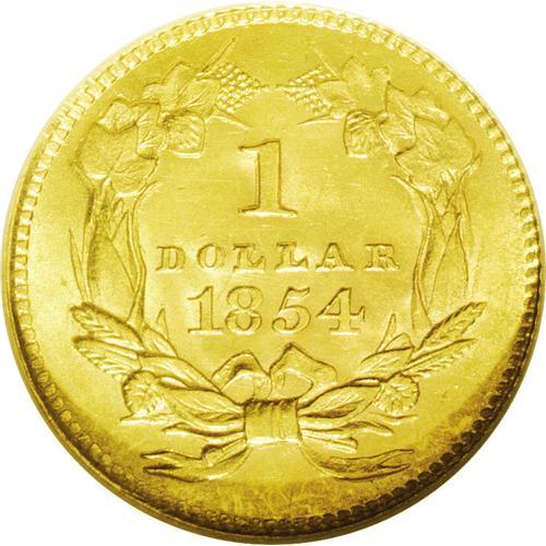 <B>1854<G$1> Type Two MS62 NGC.</B></I> One of the most popular of the gold type coins and always in strong demand from collectors, particularly in mint state grades. The present example is lustrous and well struck, there usual die clashing is not present, quite an event for this series. Apparently a middle die state as the reverse dies shows evidence of lapping, as the corn husk on the right side is weak and shallow in definition. No surface problems distract the eye and a delightful collector coin in every way.
